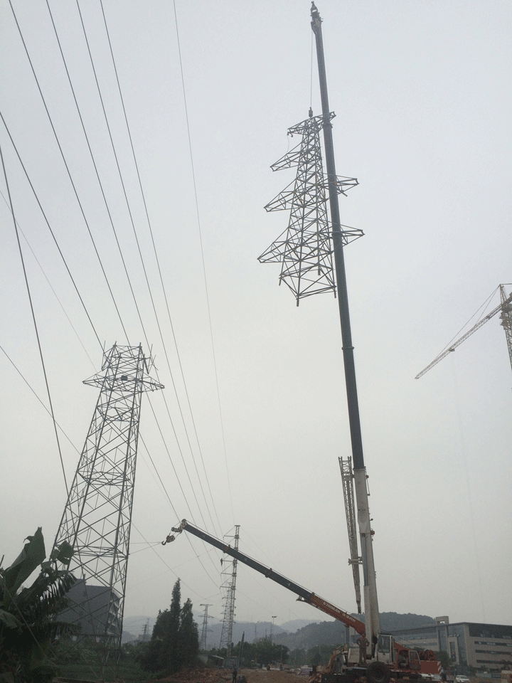 110KV半逸甲乙線N57直線塔,因塔附件道路施工,造成地形變化,基礎(chǔ)嚴(yán)重?fù)p壞(有附圖),鐵塔有1米傾斜。N57塔嚴(yán)重影響中山火炬開發(fā)區(qū)生產(chǎn)、生活及交通安全(距離路邊15米)。我公司接到任務(wù)后,火速調(diào)配所有ERS搶險設(shè)備及搶險人員,從剛剛順利完成任務(wù)的湛江(臺風(fēng)“彩虹”影響地)連夜趕到現(xiàn)場(中山),兩地相距600公里。到現(xiàn)場后充分發(fā)揮我公司團(tuán)結(jié)、和諧的實力僅用兩天時間順利完成黨交給我們的任務(wù)(勘察、設(shè)計、材料調(diào)配、組塔、放緊線)。