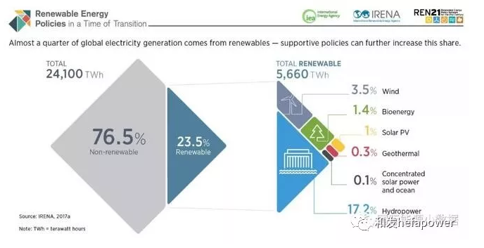 根據(jù)國(guó)際可再生能源署(IRENA)的數(shù)據(jù),2017年全球發(fā)電量24萬(wàn)億千瓦時(shí),其中23.5%來(lái)自可再生能源電源(5.66萬(wàn)億千瓦時(shí))。